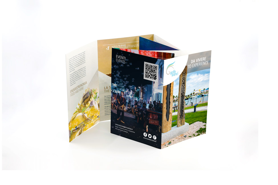 Non c'è cosa più confortevole per un turista quando va in vacanza di essere accolto e coccolato con tante informazioni utili a mostrargli un quadro generale del luogo. Anche questa è una coccola, un valido esempio, il Comune di Golfo Aranci, comprende e valorizza le esigenze del turista. La progettazione del pieghevole a 4 ante per Golfo Aranci turismo è stato progettato e stampato su carta patinata all'esterno e porosa all'interno. Il layout, con i suoi tagli obliqui, dà ampio spazio alle fotografie intervallate da brevi testi e fornisce al turista una breve guida dell'offerta della cittadina di Golfo Aranci.